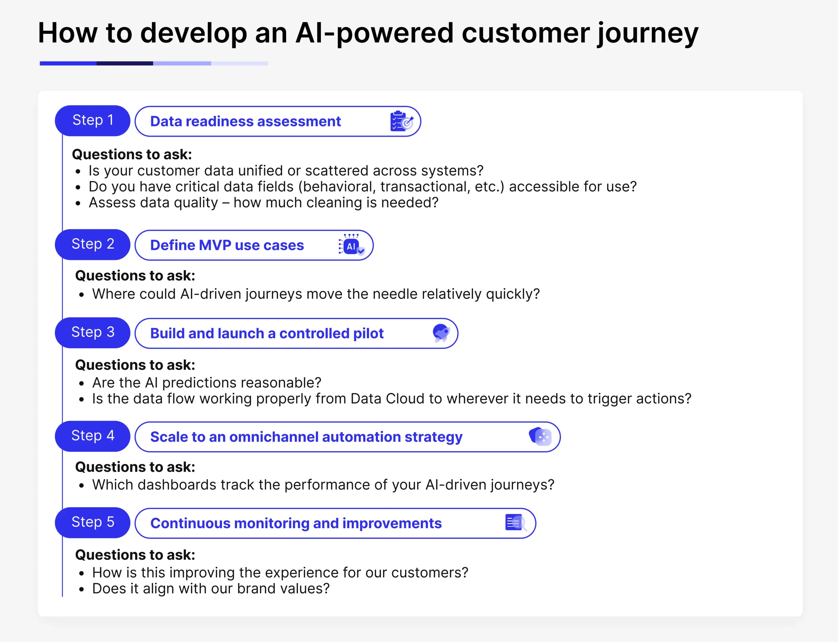 t’s tempting to envision AI improving everything at once, but the most successful rollouts start with a focused MVP. Identify a handful of high-impact use cases where AI-driven journeys could move the needle relatively quickly.