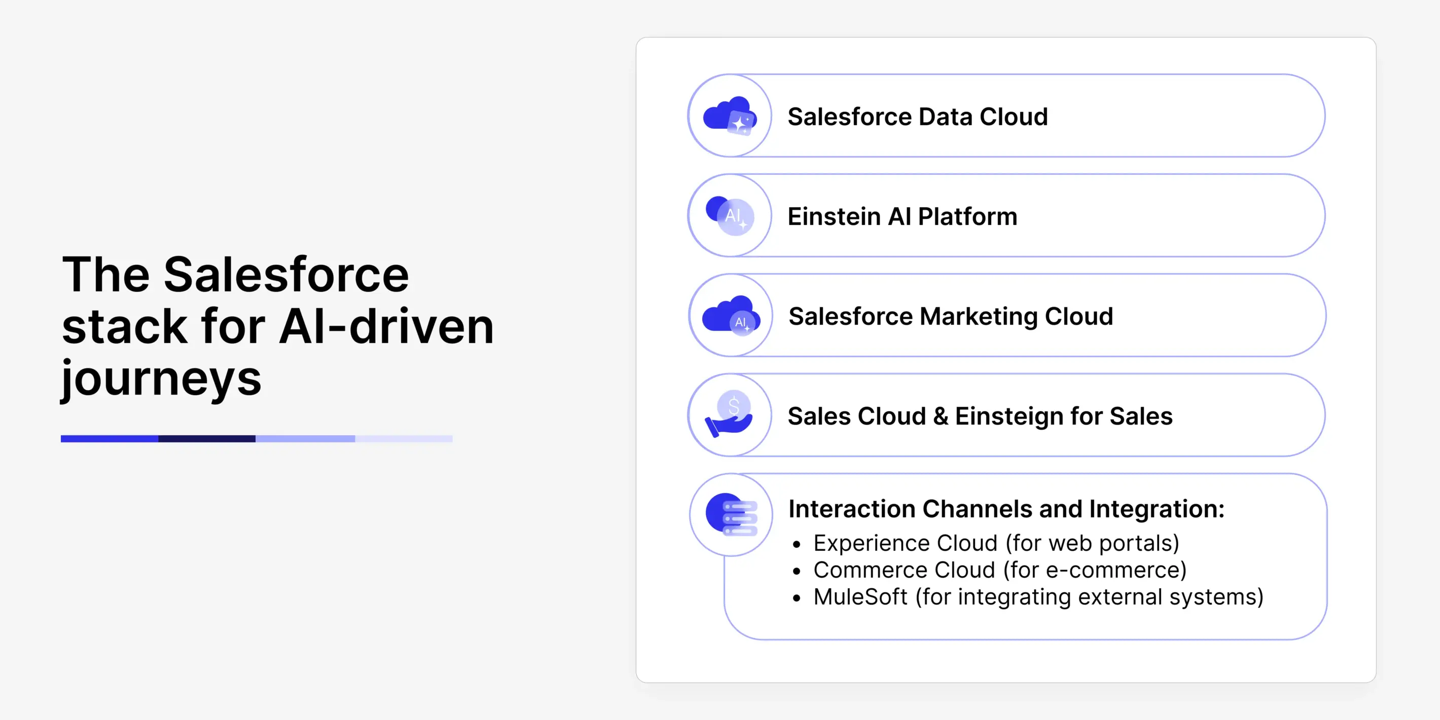 Salesforce’s platform also includes Experience Cloud (for web portals), Commerce Cloud (for e-commerce), and MuleSoft (for integrating external systems). AI-driven journeys often need to span these surfaces – e.g., an AI might decide to show an offer on the website (Experience Cloud), send an email via Marketing Cloud, and create a task in Sales Cloud, all as part of one logical journey.