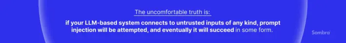 In a typical web application, user input primarily consists of data: numbers in forms, text fields, file uploads, etc. We can validate and sanitize these inputs by escaping SQL quotes and filtering scripts, which helps us identify the potential danger zones. In an LLM system, however, any user-provided content can contain hidden instructions for the AI.