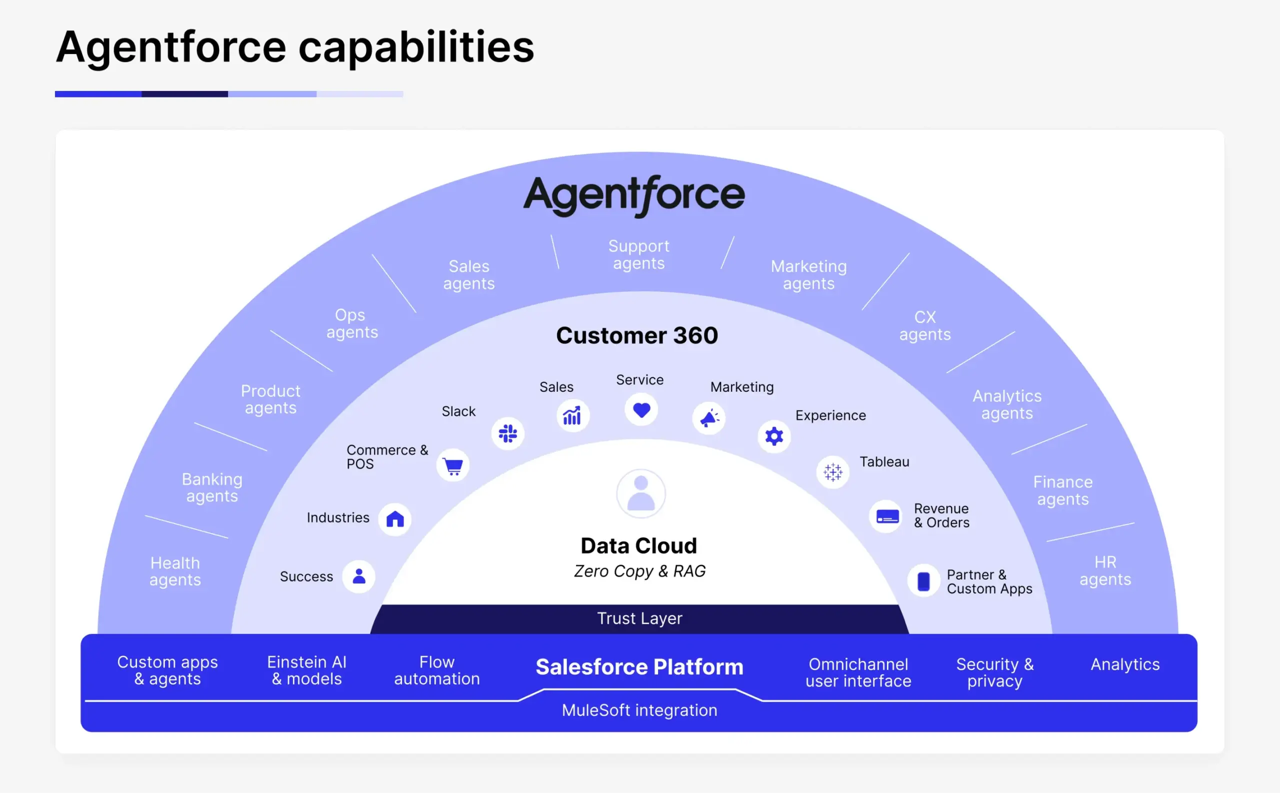 Einstein Trust Layer: Every interaction an AI agent triggers goes through this layer to ensure access to data is safe and verified while responses are relevant, trustworthy, and compliant.